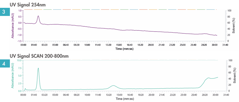 圖3與圖4:紫外檢測(cè)下化合物不可見(jiàn)。檢測(cè)初期首波化合物開(kāi)始顯現(xiàn)低強(qiáng)度信號(hào),但強(qiáng)度不足以實(shí)現(xiàn)有效收集